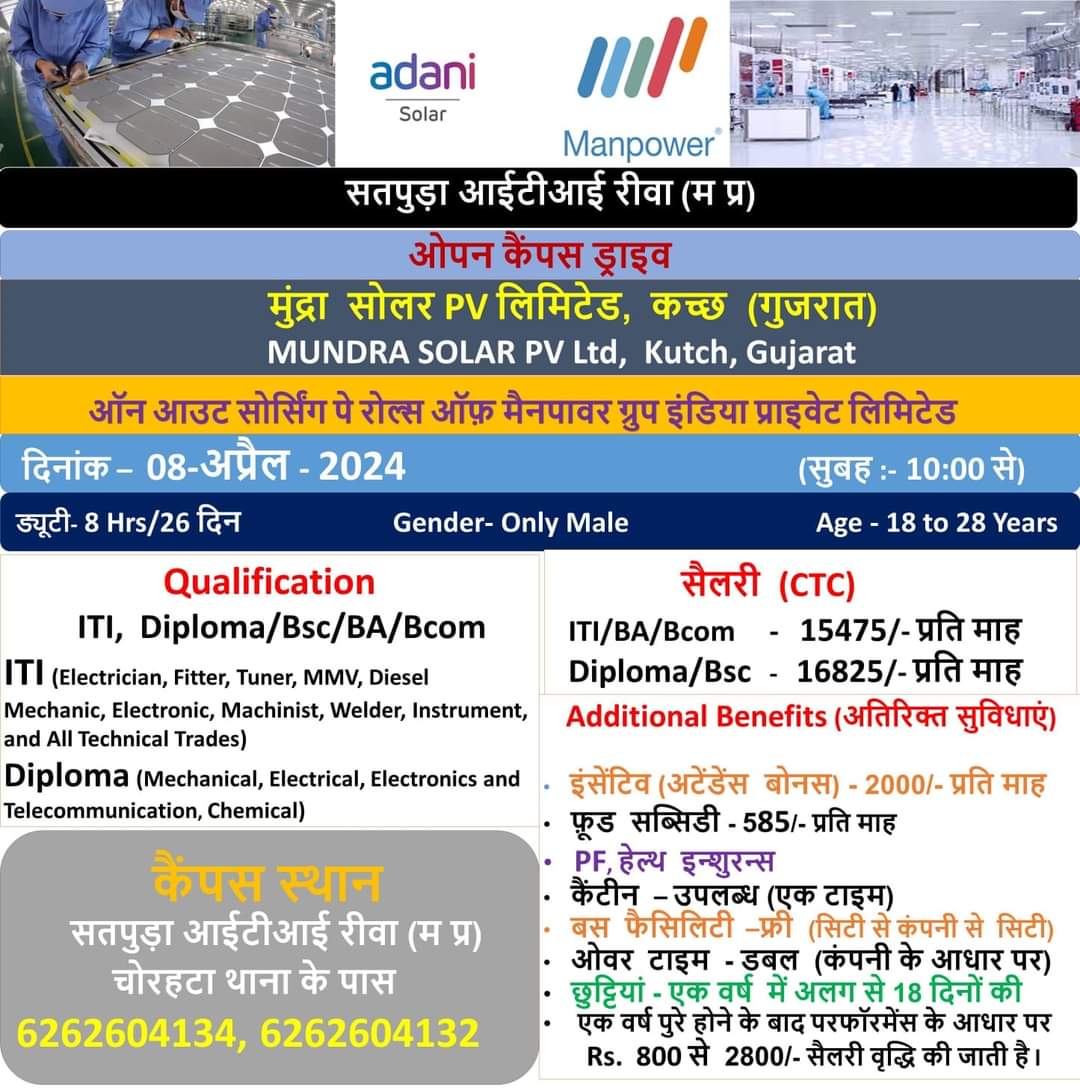 Adani Solar Job Fair 2024: अदानी सोलर कंपनी में भर्ती के लिए जॉब फेयर का आयोजन किया जा रहा है। जिसके लिए अधिकारिक नोटिस जारी कर दिया है। यह भर्ती मैनपावर ग्रुप इंडिया पे रोल पर की जा रही है। ऐसे उम्मीदवार जो एक अच्छी नौकरी खोज रहे है वह इस जॉब फेयर के माध्यम से नौकरी पा सकते है। कंपनी इस भर्ती प्रक्रिया के तहत 100 से अधिक छात्रों का चयन इंटरव्यू के माध्यम से करेगी।