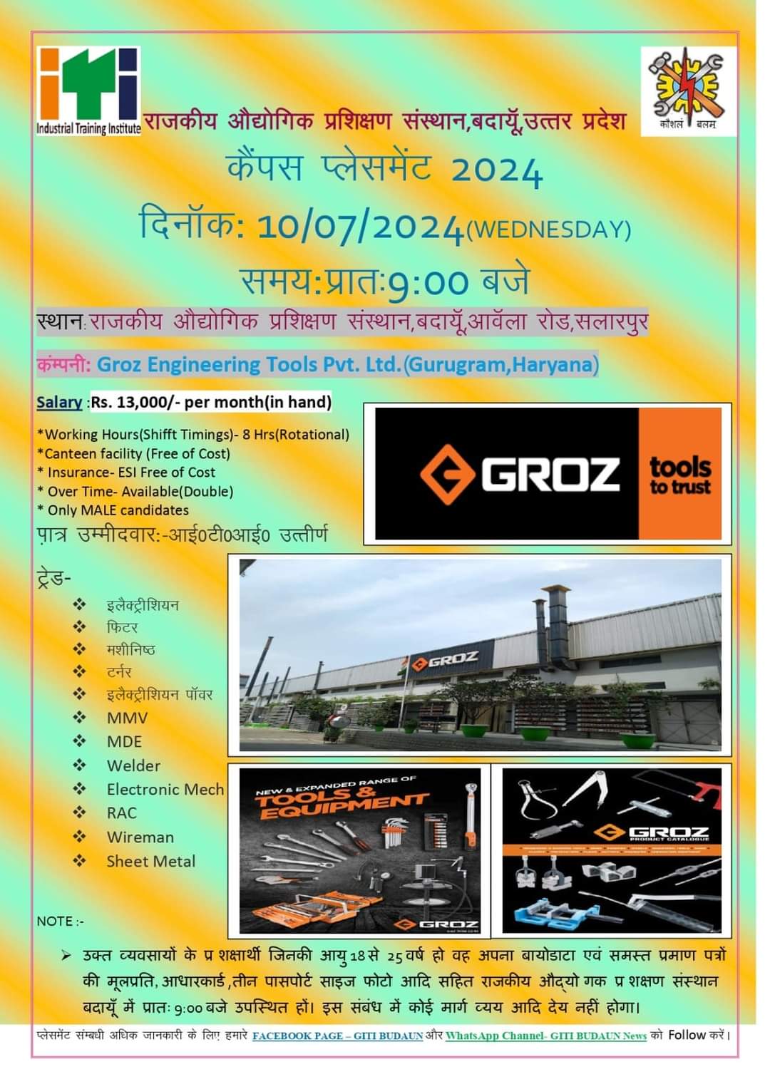 Groz Engineering Tools Campus Placement 2024: ग्रोज इंजीनियरिंग टूल्स कंपनी में भर्ती के लिए कैंपस प्लेसमेंट का आयोजन किया जा रहा है। कंपनी इस भर्ती प्रक्रिया के तहत 100 से अधिक पदों पर इन्टरव्यू के माध्यम से छात्रों का चयन करेंगी। एक अच्छी प्राईवेट नौकरी की तलाश कर रहे आईटीआई पास छात्रों के लिए Groz इंजीनियरिंग कंपनी में नौकरी पाने का सुनहरा अवसर है।