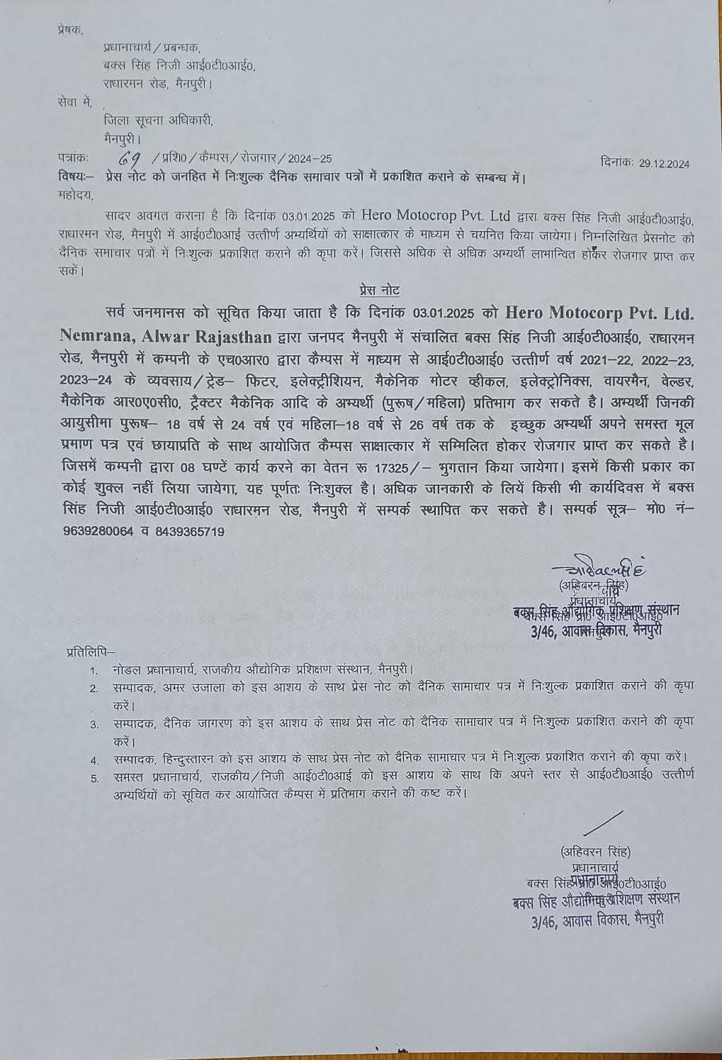 Hero Motocorp कंपनी में महिला पुरुष छात्रों के लिए डायरेक्ट भर्ती निकाली गई है। इस भर्ती के लिए आधिकारिक नोटिस जारी कर दिया गया है। जॉब कैंप का आयोजन उत्तर प्रदेश के मैनपुरी में किया जा रहा है। आयोजित हो रहे जॉब कैंप में 10वीं के साथ आईटीआई पास छात्र सामिल हो सकेंगे जिन्होने वर्ष 2021 से 2024 के बीच परीक्षा उत्तीर्ण की हो। इस भर्ती के लिए सामिल होने वाले पुरुष छात्रों की आयु सीमा 18 वर्ष से 24 और महिलाओ की 18 वर्ष से 26 वर्ष होनी चाहिए।