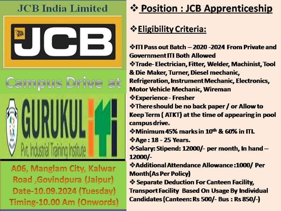 10वीं के साथ आईटीआई पास छात्रों के लिए JCB India Limited में काम करने का सुनहरा मौका है। कम्पनी से जुड़ी अन्य महत्वपूर्ण जानकारियां नीचे दी गई है। कंपनी से जुड़ी जानकारी ध्यान से पढ़े।