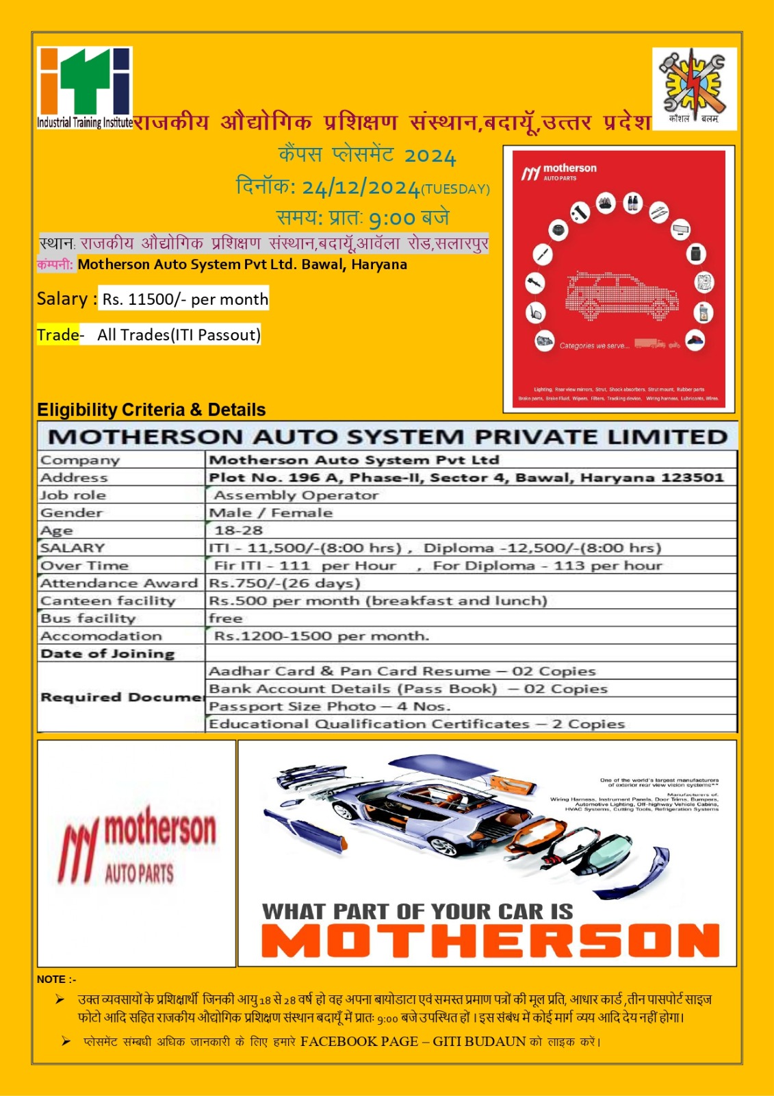 इस भर्ती के लिए 10वीं के साथ सभी तकनीकी ट्रेड से आईटीआई और डिप्लोमा पास छात्र सामिल हो सकेंगे है। जिनकी आयु 18 वर्ष से 27 वर्ष है। चयनित होने वाले उम्मीदवारों को 11500 से 12500 रुपए सैलरी मिलेंगी। इच्छुक उम्मीदवारों लिए Motherson India Limited में काम करने का सुनहरा मौका है। कम्पनी से जुड़ी अन्य महत्वपूर्ण जानकारियां नीचे दी गई है। कंपनी से जुड़ी जानकारी ध्यान से पढ़े।