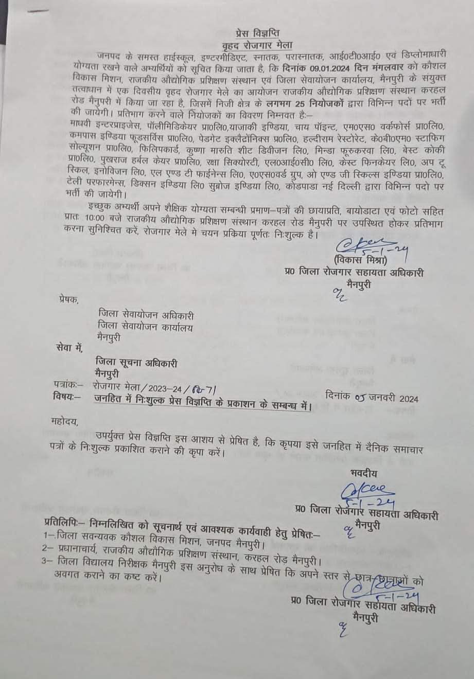 UP Rojgar Mela 2024: उत्तर प्रदेश में एक बृहद रोजगार मेले का आयोजन किया जा रहा हैं जिसमे देशभर से 25 से अधिक प्राइवेट कंपनियां प्रतिभाग करेंगी। एक अच्छी प्राइवेट नौकरी की तलाश कर रहे युवाओं के लिए नौकरी पाने का सुनहरा अवसर है। यह रोजगार मेला यूपी के मैनपुरी में आयोजित किया जा रहा है। मैनपुरी रोजगार मेला के द्वारा 2000 से अधिक बेरोजगार युवाओं को योग्यता के अनुसार नौकरी मिलेंगी।